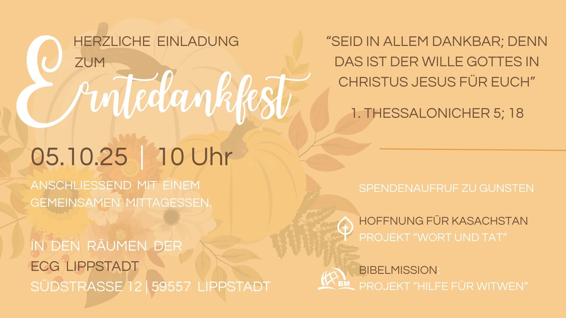 Erntedankfest + Zu Google Kalender hinzufügen+ iCal / Outlook exportieren DatumOkt. 05 2025Abgelaufen! Uhrzeit 10:00 - 11:45 StandortECG LippstadtECG Lippstadt, Suedstraße 12,59557 LippstadtTeile diese Veranstaltung